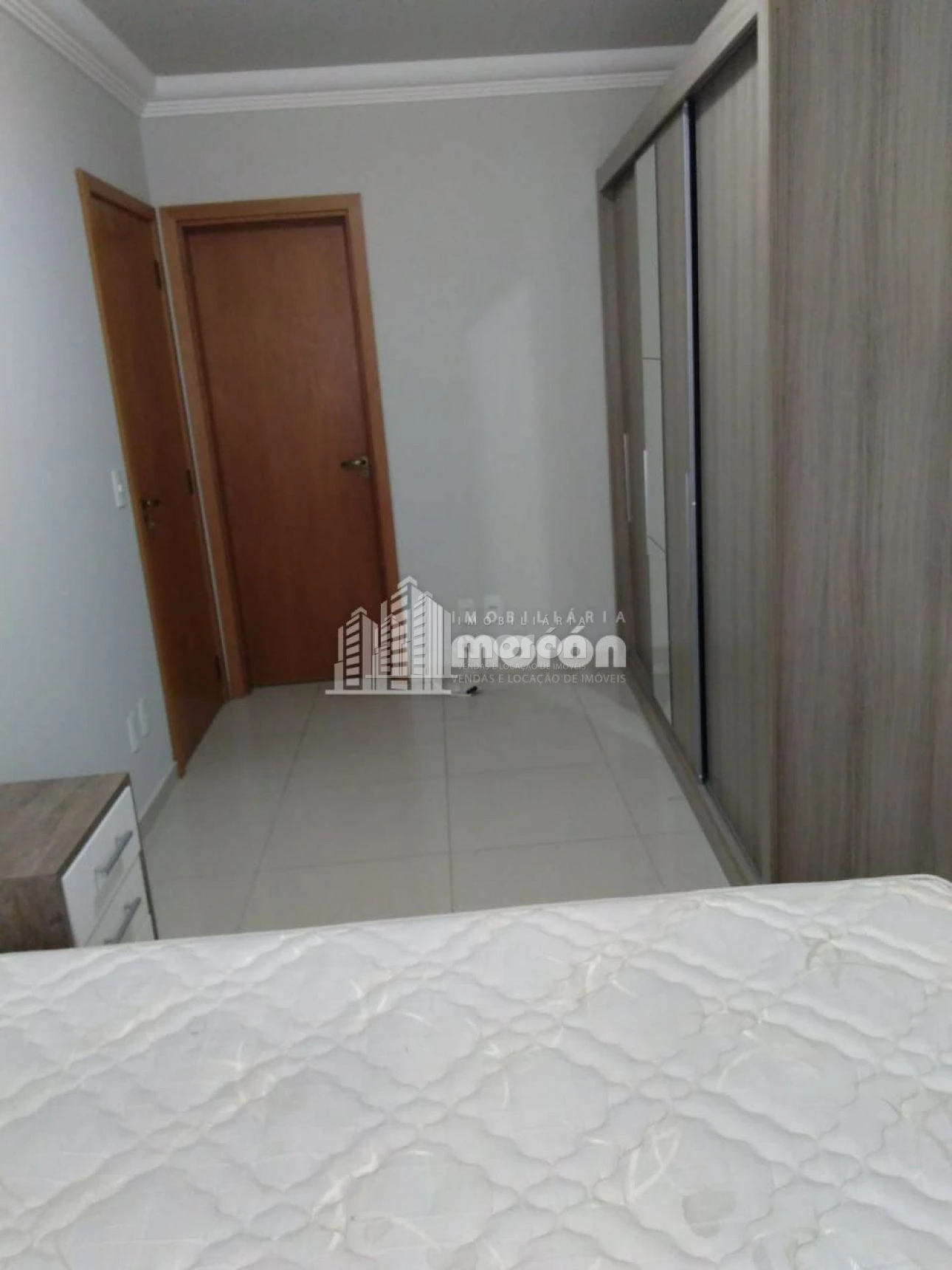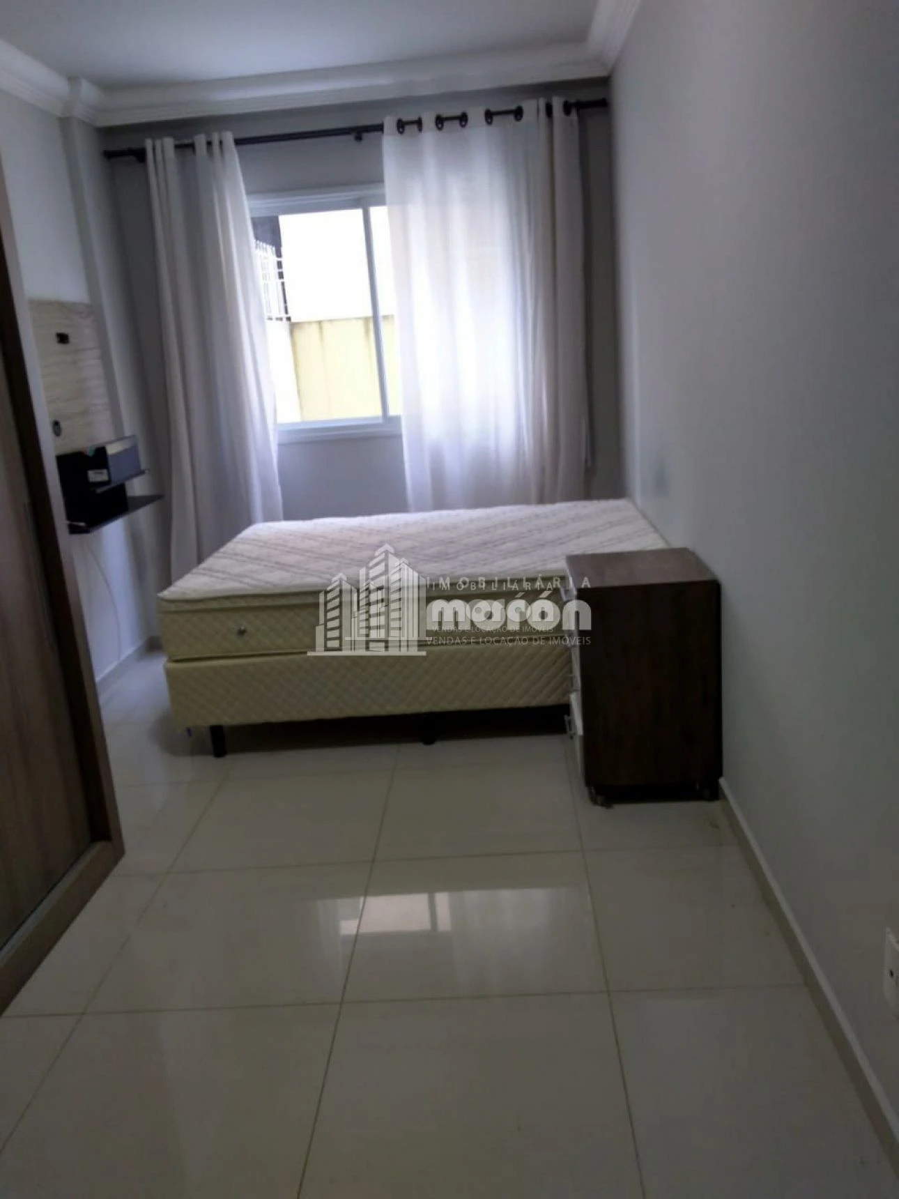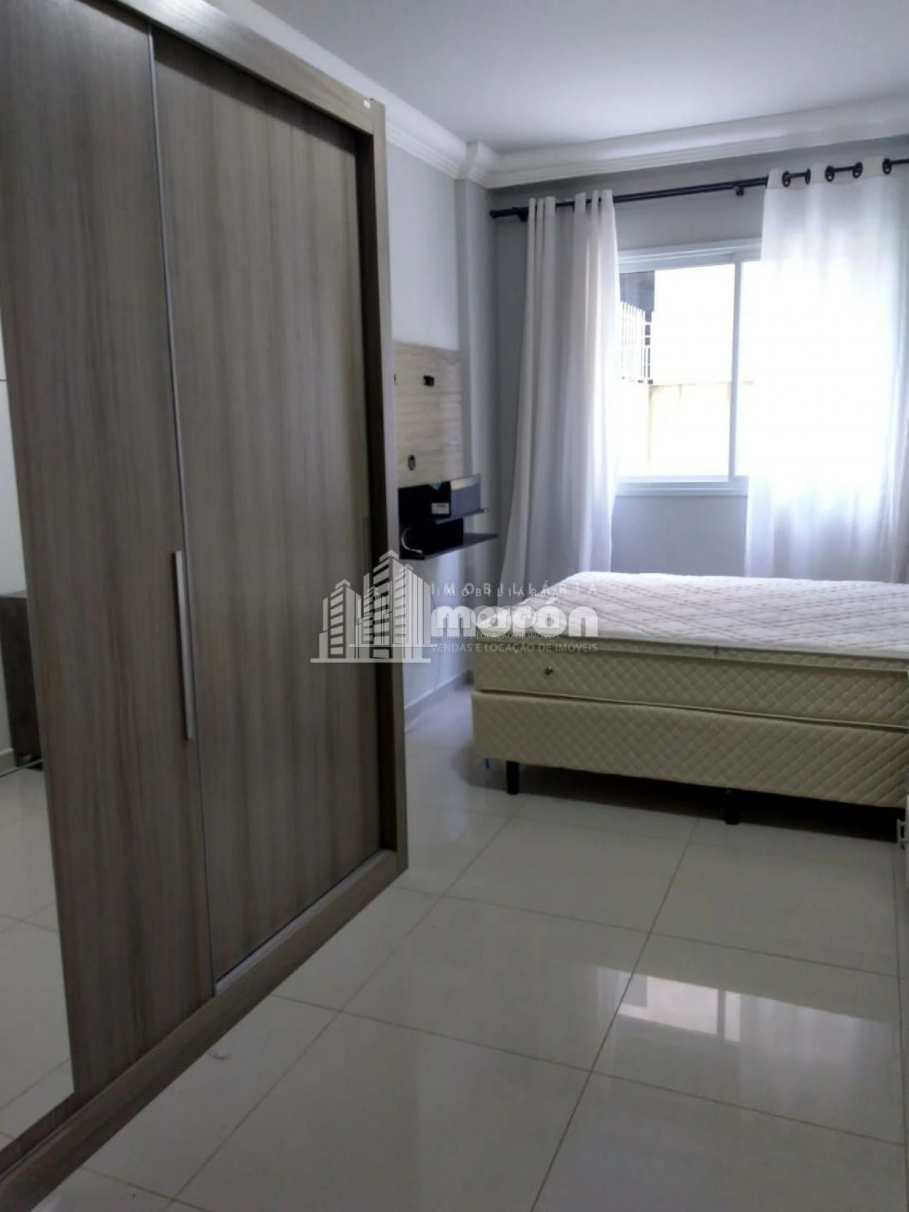 - Quarto com cama box casal, guarda roupa e painel de TV